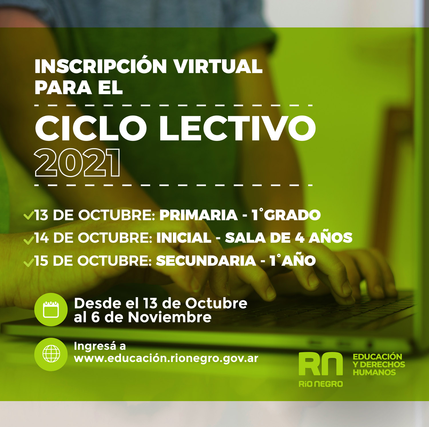En función del contexto sanitario por COVID-19, las inscripciones al Ciclo Lectivo 2021, para Educación Inicial, 1º grado y 1º año, se realizará en forma online a través de la página del Ministerio de Educación y Derechos Humanos.