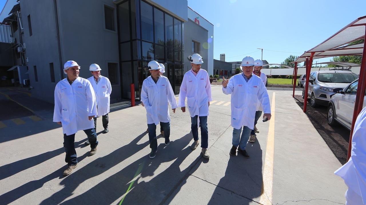 El ministro de Producción y Agroindustria, Carlos Banacloy, visitó la nueva planta de envasado en origen de la empresa Jugos SA, que tiene su sede en Villa Regina. Junto al vicepresidente de Senasa, Rodolfo Acerbi, participaron de un recorrido por las instalaciones de la empresa juguera.