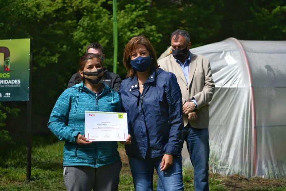 Ana es vecina del barrio Omega, de San Carlos de Bariloche, y participó de la capacitación en armado de estructuras, siembra y riego del programa Invernaderos, miles de oportunidades. Recientemente recibió su certificado de finalización del curso, junto con el kit para el armado del microtúnel en su vivienda.