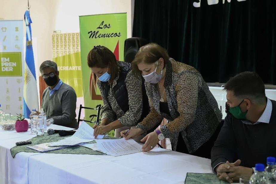 La Gobernadora, Arabela Carreras, firmó hoy en Los Menucos el convenio que dará continuidad a la ampliación del Plan Director de cloacas y el acta compromiso para la construcción de 18 viviendas y 10 mejoramientos habitacionales. Además, otorgó aportes a vecinos y vecinas. Lo hizo junto a la intendenta Mabel Yahuar, durante su visita a esta localidad de la Región Sur.