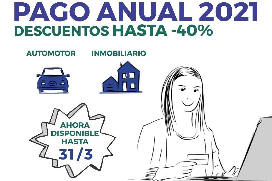 Desde mediados de enero está vigente la modalidad de pago anual, que permite realizar en un único pago el impuesto automotor e inmobiliario con descuentos especiales de hasta un 40%. La fecha de vencimiento se extendió hasta el último día del mes de marzo.
