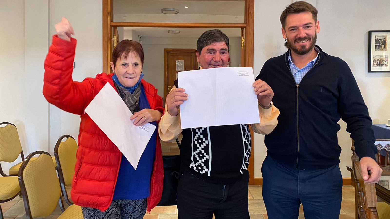 Norma y Hugo Valdebenito viven hace más de 40 años en su casa del Barrio Esperanza, de San Carlos de Bariloche. Hoy, la Escribana interviniente, junto al ministro de Gobierno y Comunidad, Rodrigo Buteler, firmaron el Acta Notarial de Regularización Dominial de la propiedad (Ley Pierri).