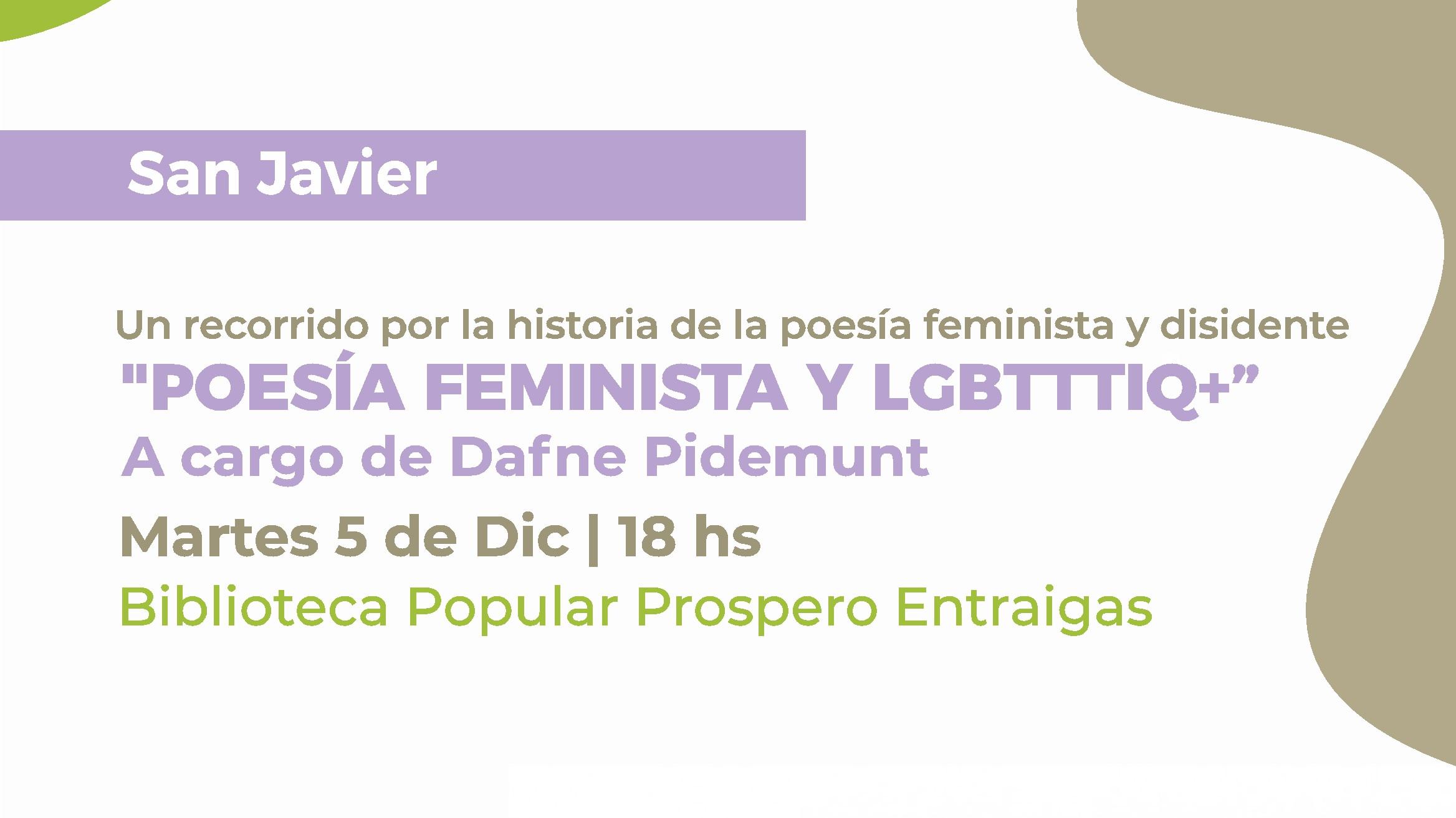 Este martes, 5 de diciembre, a las 18hs., en la Biblioteca Próspero Entraigas de San Javier, se llevará a cabo el taller de poesía feminista y LGBTTTIQ+ “Un recorrido de la historia de la poesía feminista y disidente”, a cargo de la escritora Dafne Pidemunt.