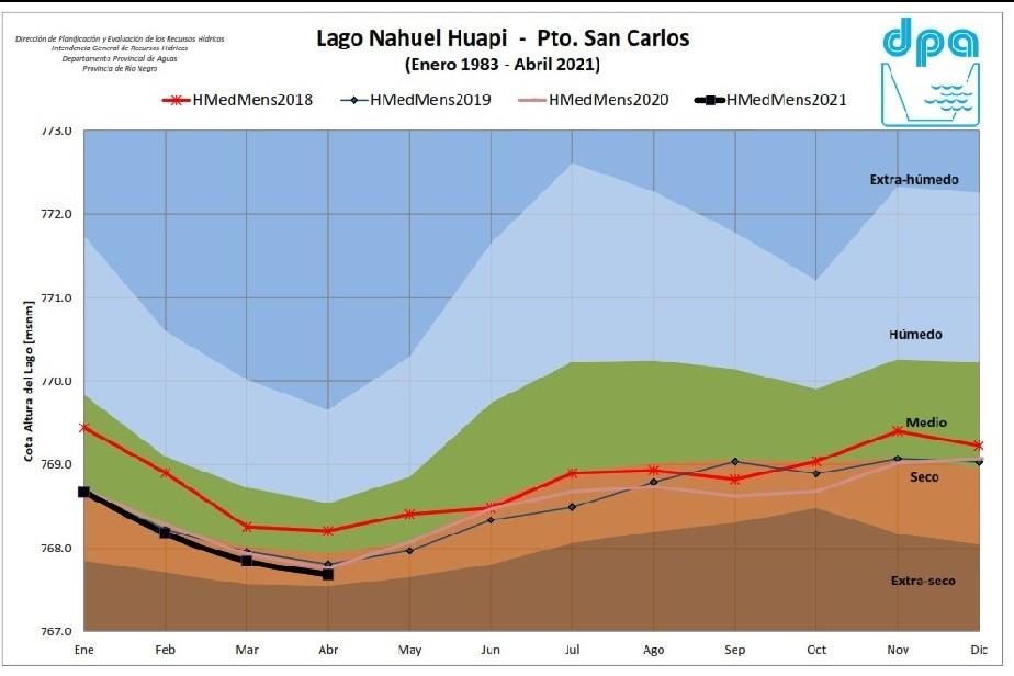 De acuerdo al análisis de frecuencia de niveles de la estación de medición del Puerto San Carlos, los niveles del lago Nahuel Huapi, se encuentran en condición de año seco por tercer año consecutivo.