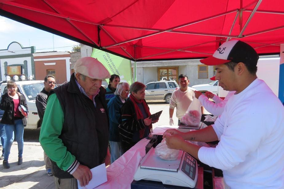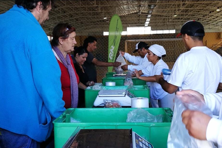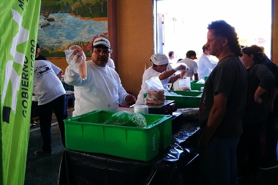 Durante toda la mañana, los vecinos se acercaron al Gimnasio local a comprar pescados y mariscos, traídos del Golfo San Matías como parte de la campaña para promocionar su consumo.